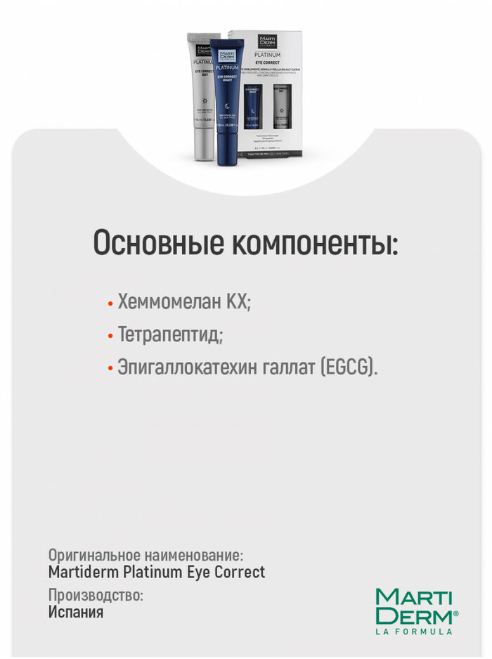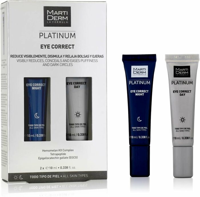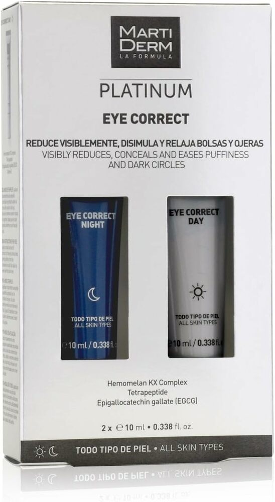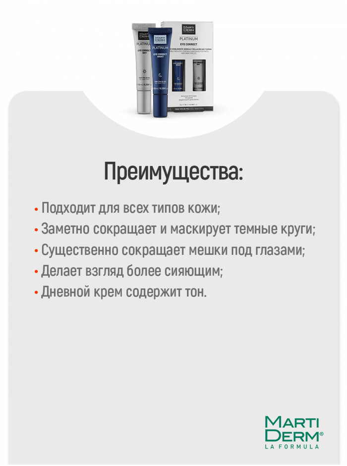 Набор для кожи вокруг глаз - дневной и ночной крем Martiderm Platinum Eye Correct Day & Night 2 х 10 мл предлагает комплексный уход за нежной кожей вокруг глаз. Эти кремы помогают уменьшить видимость морщин, отечности и темных кругов, обеспечивая свежий и отдохнувший вид.