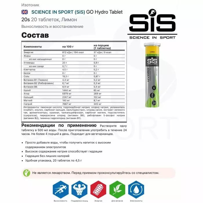Изотонический напиток в растворимых таблетках с кофеином от бренда Science in Sport — это отличный выбор для активных людей. В каждой упаковке содержится 20 таблеток с освежающим лимонным вкусом, которые помогут поддерживать уровень гидратации во время тренировок и соревнований.
