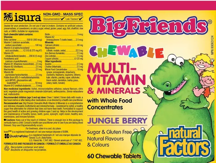 Жевательные мультивитамины Big Friends — это комплексная и вкусная жевательная мультивитаминная и минеральная формула, подслащенная ксилитом, который, в свою очередь, является здоровой альтернативой сахару для детей и не вредит их зубам. Продукт создан для поддержания крепкого здоровья активных и растущих детей в возрасте от 3 лет и старше. Помогает в развитии и поддержании здоровья костей, зубов, десен и зрения. Так же поддерживает барьерную функцию,ночное зрение, здоровье кожи и иммунной системы.