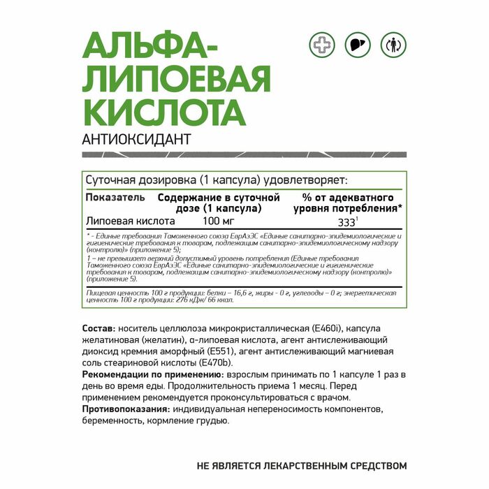 NaturalSupp Alpha Lipoic Acid 100 мг — это пищевая добавка, содержащая альфа-липоевую кислоту, мощный антиоксидант, который помогает нейтрализовать свободные радикалы и уменьшать окислительный стресс в организме. Альфа-липоевая кислота обладает уникальной способностью действовать как в водной, так и в жировой среде, что делает ее эффективной в защите клеток от повреждений, а также в поддержке общего состояния здоровья.