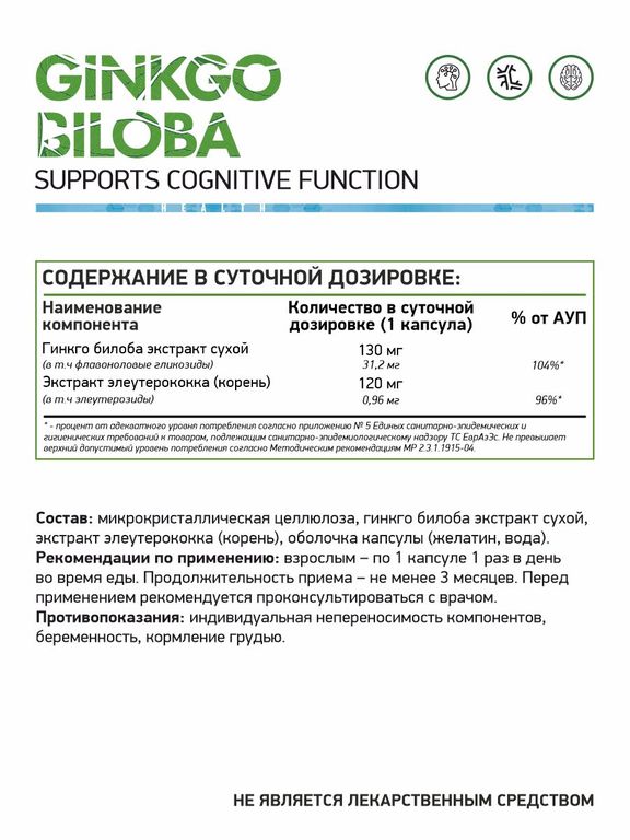 NaturalSupp Гинкго билоба экстракт 50:1 (120 мг) элеутерококк экстракт (200 мг), 60 капсул