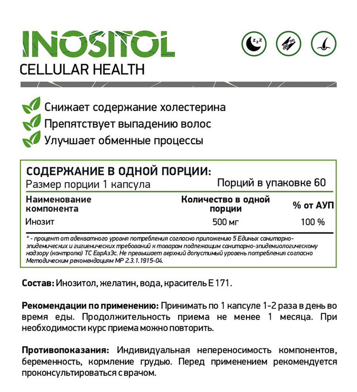 Инозитол (500 мг) — это витаминоподобное вещество, относящееся к группе В, также известное как витамин В8. Он играет важную роль в поддержании здоровья сердечно-сосудистой и нервной систем, а также способствует улучшению обмена веществ.