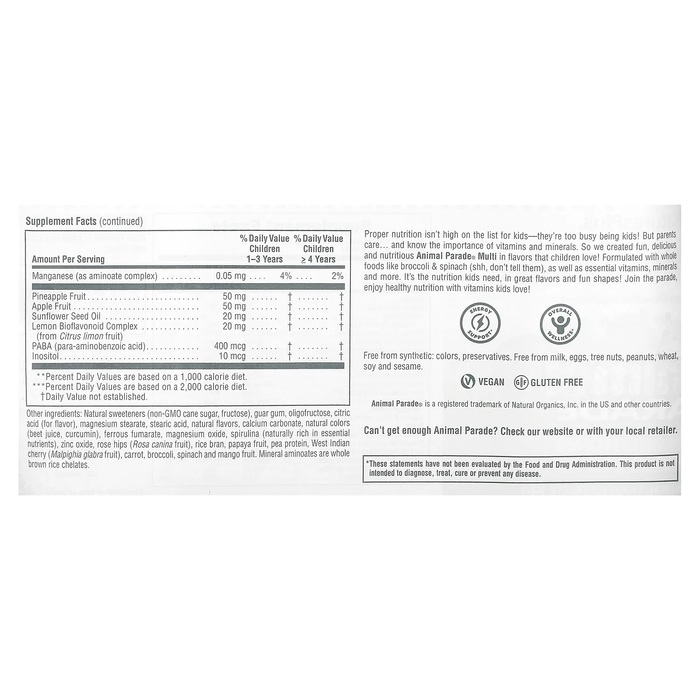 Натуральные подсластители (тростниковый сахар без ГМО, фруктоза), гуаровая камедь, олигофруктоза, лимонная кислота, стеарат магния, стеариновая кислота, натуральные ароматизаторы, карбонат кальция, натуральные красители (свекольный сок, куркумин), фумарат железа, оксид магния, спирулина (богатый натуральный источник незаменимых питательных веществ), оксид цинка, плоды шиповника (Rosa canina), рисовые отруби, плоды папайи, плоды мальпигии (Malpighia glabra), морковь, гороховый протеин, брокколи, шпинат и плоды манго. Минеральные аминоаты — хелаты из цельного коричневого риса.