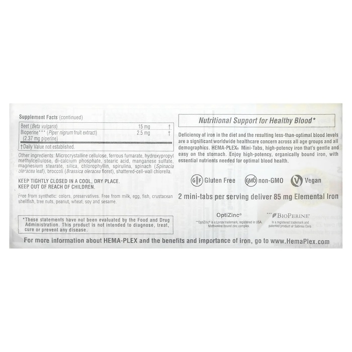 Дефицит железа в рационе и, как следствие, низкий уровень железа в крови — серьезная проблема в сфере здравоохранения во всем мире для всех возрастных и демографических групп. Hema-Plex® Mini-Tabs, высокоэффективное железо, мягкое и легкое для желудка. Наслаждайтесь высокоэффективным органически связанным железом с незаменимыми питательными веществами, необходимыми для поддержания нормального состава крови.