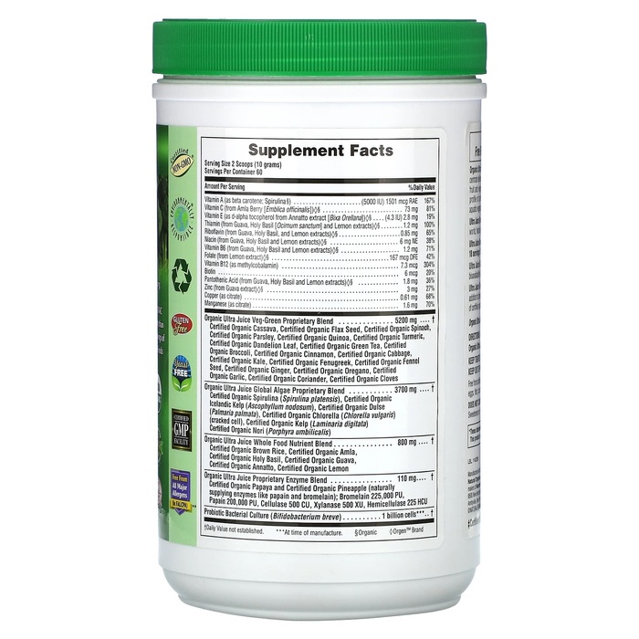 Зеленый порошок Organic Ultra Juice - это сертифицированный органический зеленый пищевой концентрат, обладающий питательными свойствами самых полезных для здоровья соков из зеленых фруктов и овощей в мире. Эти выдающиеся питательные свойства содержат полный спектр защитных фитонутриентов, которыми естественным образом много содержится в наземных и водных овощах.