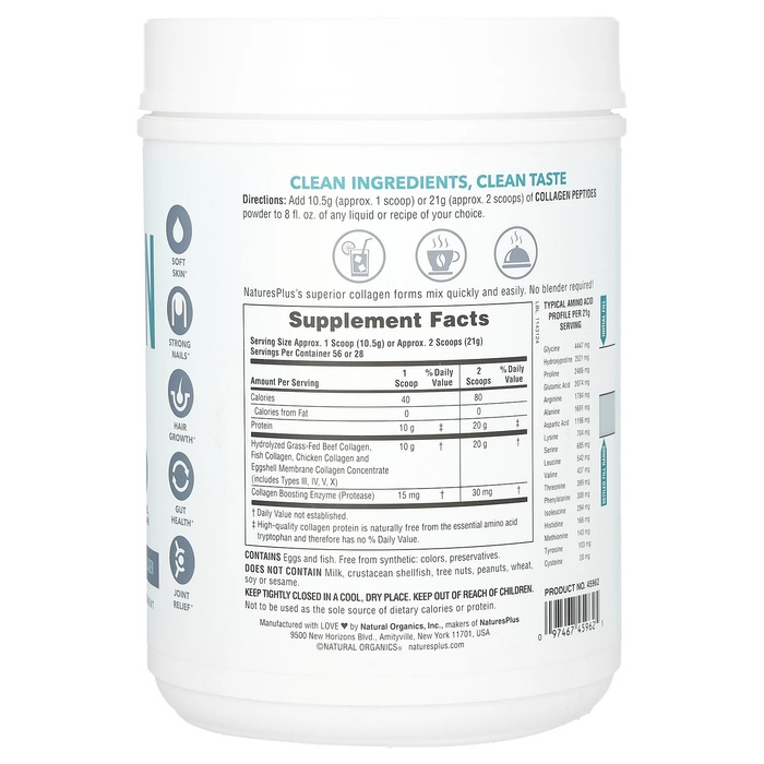 Для лучшего самочувствия и внешнего вида используйте NaturesPlus с пептидами коллагена. Укрепите здоровье волос, кожи, ногтей, суставов, иммунной системы и многих других систем организма с помощью пептидов протеина коллагена.