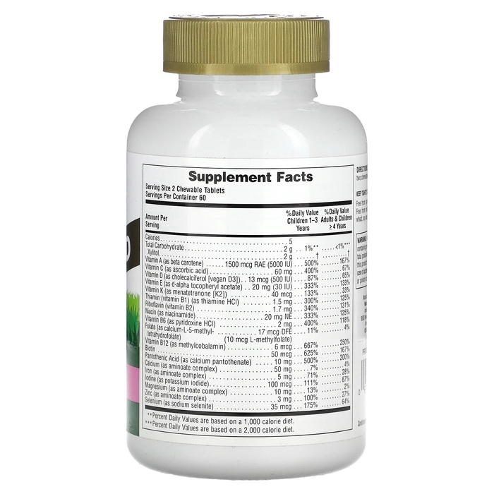 ИнгредиентыКсилитол, карбонат кальция, лимонная кислота (ароматизатор), стеариновая кислота, гуаровая камедь, натуральные ароматизаторы, смесь органических цельных продуктов, сертифицированная по стандарту Organic Gold Standard (органическое яблоко, ростки кудрявой капусты, листовая капуста, крапива, мицелий гриба рейши, ростки брокколи, ростки цветной капусты, корнеплод моркови, петрушка, шпинат, томат, спирулина, хлорелла, голубика, экстракт ацеролы, сок свеклы, мицелий гриба-барана, мицелий гриба шиитаке, мицелий гриба кордицепса, черника, брокколи, кудрявая капуста, цветная капуста), стеарат магния, бурые водоросли, натуральный краситель (свекольный сок, куркумин), фумарат железа, оксид магния, оксид цинка, плоды шиповника (Rosa canina), плоды папайи, плоды мальпигии (Malpighia glabra), морковь, рисовые отруби, плоды манго, яблочный пектин, брокколи, шпинат. Минеральные аминоаты — хелаты из цельного коричневого риса.