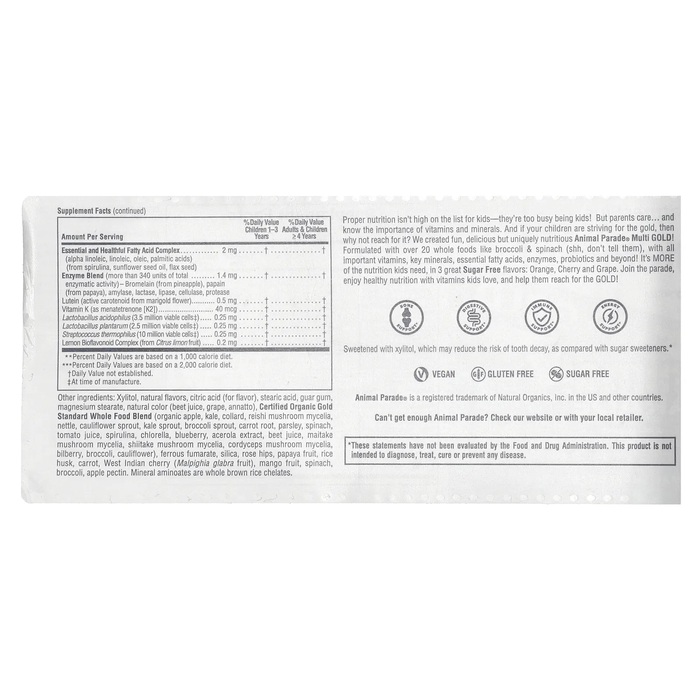 Правильное питание не является приоритетом для детей - они слишком заняты, будучи детьми! Но родители заботятся и знают о важности витаминов и минералов. А если ваши дети стремятся к золоту, почему бы им не потянуться за ним? Мы создали веселый, вкусный, но уникально питательный Animal Parade® Multi GOLD! Содержит более 20 цельных продуктов, таких как брокколи и шпинат (тсс, не говорите им), со всеми важными витаминами, ключевыми минералами, незаменимыми жирными кислотами, ферментами, пробиотиками и многим другим! Это БОЛЬШЕ необходимого детям питательного вещества в 3-х великолепных вкусах без сахара: Апельсин, вишня и виноград. Присоединяйтесь к параду, наслаждайтесь здоровым питанием с любимыми детьми витаминами и помогите им достичь ЗОЛОТА!