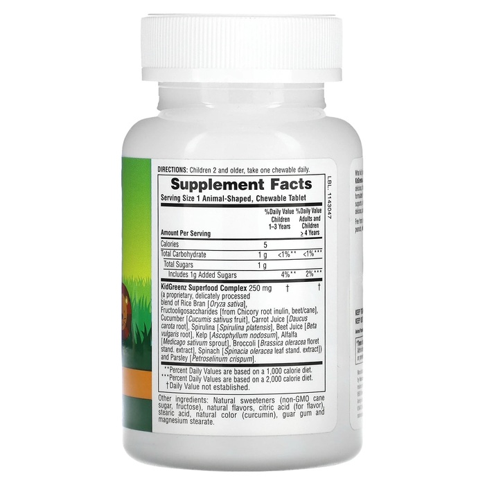 Натуральные подсластители (тростниковый сахар без ГМО, фруктоза), натуральные ароматизаторы, микрокристаллическая целлюлоза, растительная целлюлоза, лимонная кислота (для ароматизатора), натуральный краситель (аннато, виноград, сок свеклы, куркумин), карбонат кальция, стеарат магния, гуаровая камедь, фумарат железа, оксид магния, спирулина (богатый природный источник незаменимых питательных веществ), оксид цинка, плоды шиповника (Rosa canina), цитрат калия, рисовые отруби, плоды папайи, морковь, плоды мальпигии (Malpighia glabra), брокколи, шпинат, плоды манго, аминоат калия, битартрат холина и стеариновая кислота. Минеральные аминоаты — хелаты из цельного коричневого риса.