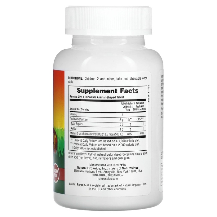 Детские жевательные таблетки Animal Parade® с витамином D3 500 МЕ имеют приятный вкус черешни и сделаны в форме животных, которых так любят дети.