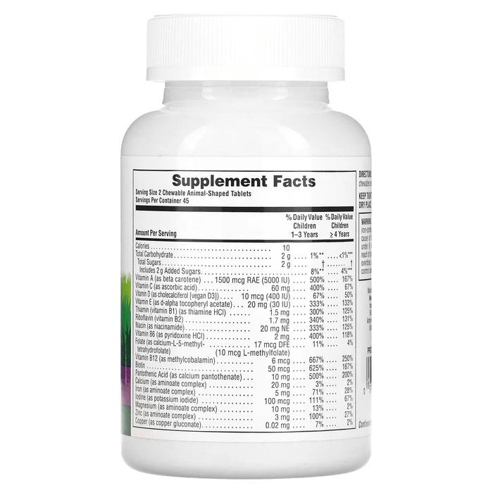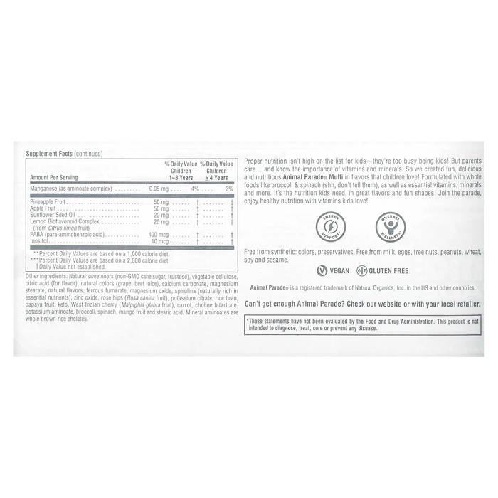Натуральные подсластители (тростниковый сахар без ГМО, фруктоза), целлюлоза (растительного происхождения), лимонная кислота, натуральный краситель (виноград, свекла), карбонат кальция, стеарат магния, натуральные ароматизаторы, фумарат железа, оксид магния, спирулина (богатый природный источник питательных веществ), оксид цинка, плоды шиповника (Rosa canina), цитрат калия, цельный коричневый рис, плоды папайи, йодид калия, морковь, плоды мальпигии (Malpighia glabra), битартрат холина, аминоат калия, брокколи, шпинат, плоды манго и стеариновая кислота, минеральные аминоаты (хелаты из цельного коричневого риса).