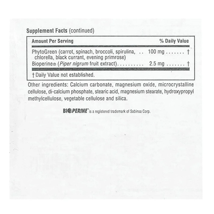 Карбонат кальция, микрокристаллическая целлюлоза, оксид магния, дикальций фосфат, стеариновая кислота, стеарат магния, целлюлоза (растительного происхождения), диоксид кремния и фармацевтическая глазурь.