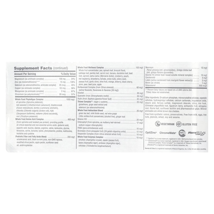 Дикальций фосфат, микрокристаллическая целлюлоза, растительная целлюлоза, гидроксипропилцеллюлоза, карбонат кальция, оксид магния, стеариновая кислота, сульфат железа, стеарат магния, диоксид кремния, сульфат марганца, коричневый рис, ирландский мох (Chondrus crispus), корень астрагала, корень эхинацеи узколистной (Echinacea angustifolia), ягоды бирючины (Ligustrum), плоды лимонника (Schisandra chinensis), листья чабреца, подсолнечный лецитин, фармацевтическая глазурь. Минеральные аминоаты — хелаты из цельного коричневого риса.