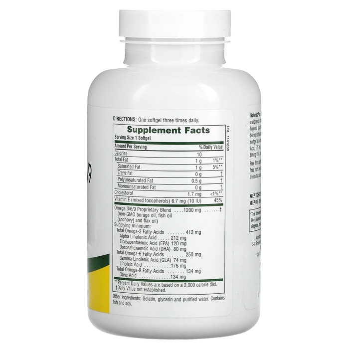 NaturesPlus Ultra OMEGA 3/6/9 содержит точно откалиброванные пропорции ненасыщенных жирных кислот из рыбьего жира высочайшего качества, а также из масла бурачника холодного отжима без ГМО и льняного масла. Каждая мягкая таблетка, которую легко глотать, содержит минимум 212 мг альфа-линоленовой кислоты, 176 мг линолевой кислоты, 74 мг ГЛК, 120 мг ЭПК, 80 мг ДГК и 134 мг олеиновой кислоты.