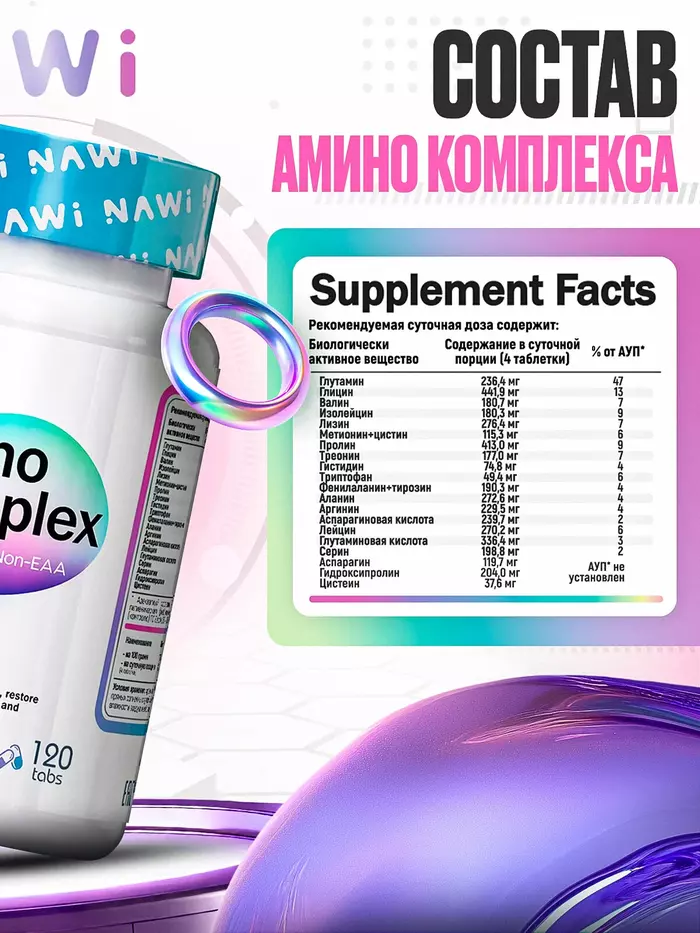 Аминокислотный комплекс от NAWI — это высококачественная добавка, предназначенная для поддержки спортивных результатов и восстановления после тренировок. В каждой упаковке содержится 120 капсул, которые обеспечивают организм необходимыми аминокислотами.