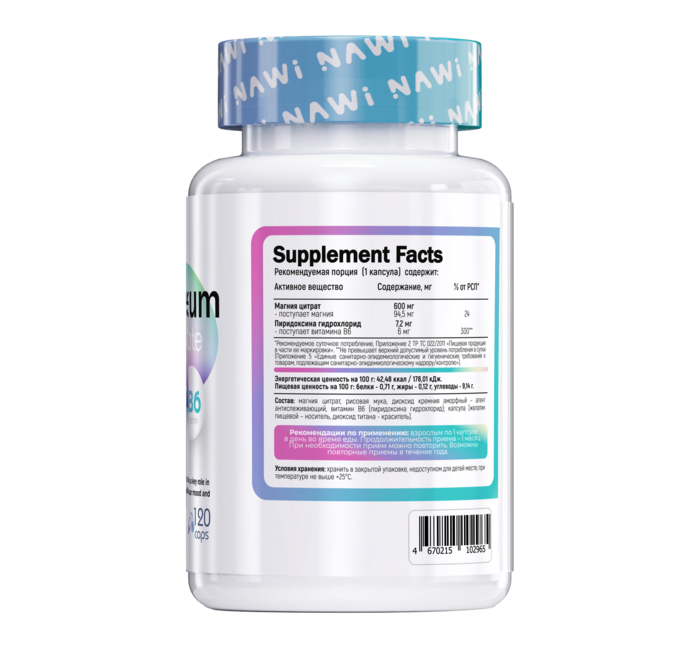 NAWI Цитрат магния + Витамин B6, 120 капсул
