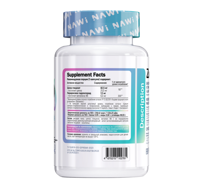 NAWI Цинк+ Витамин B6 (30 мг), 60 капсул