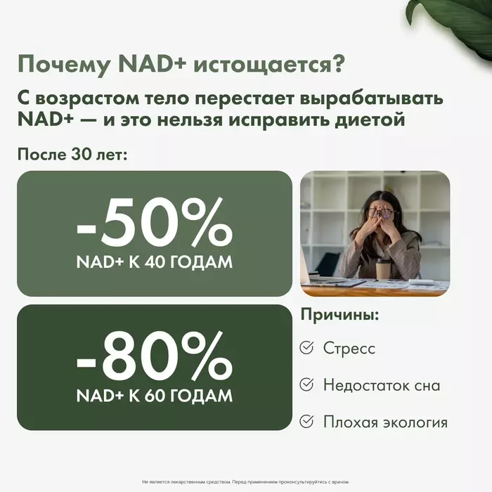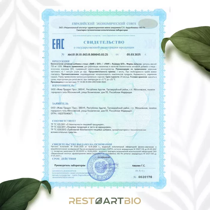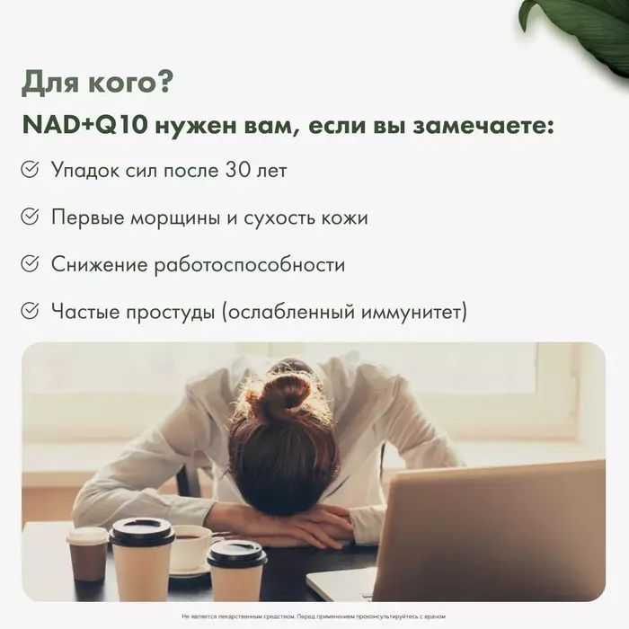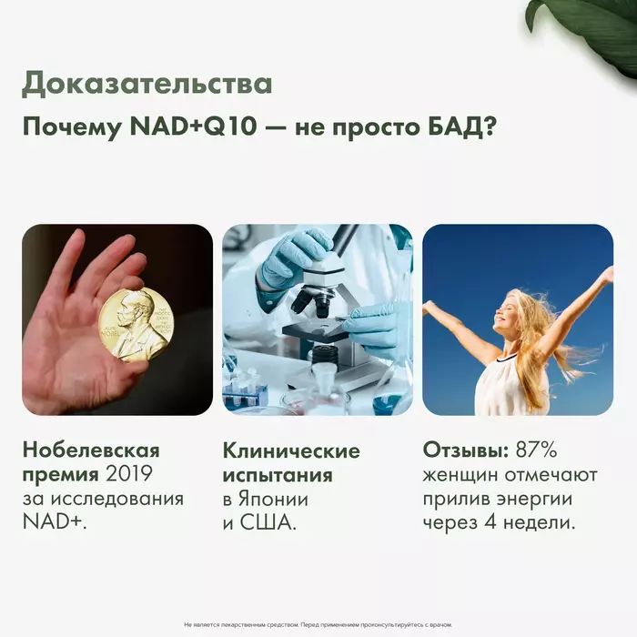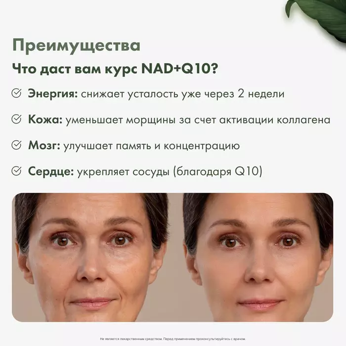 • Энергетическая поддержка: NMN и коэнзим Q10 способствуют выработке энергии на клеточном уровне, что помогает поддерживать активность и работоспособность.