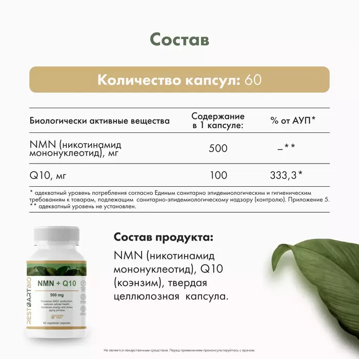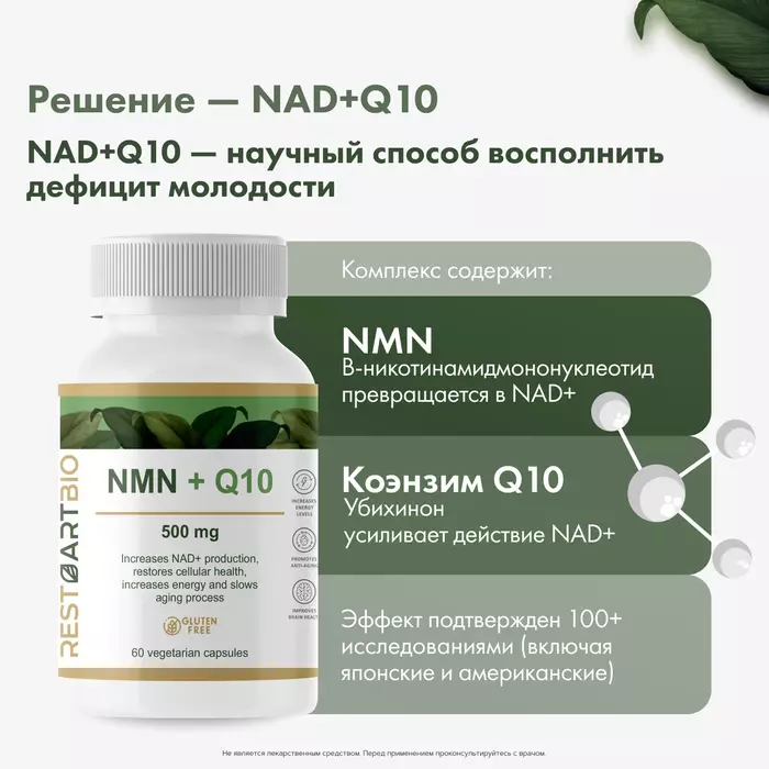 RestartBio БАД NMN + Q10 (500 мг), 60 капсул