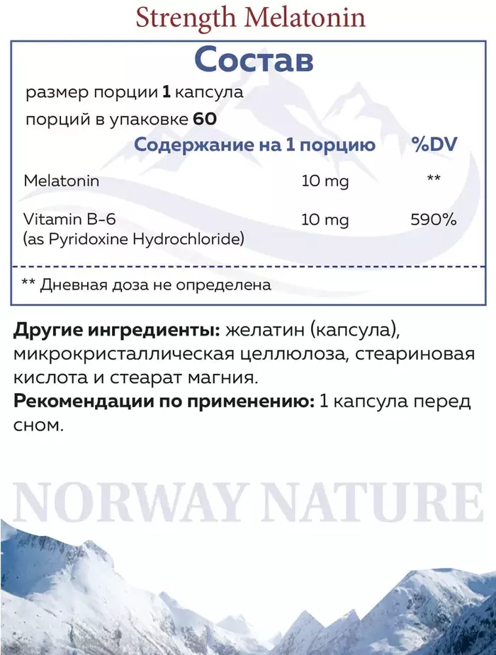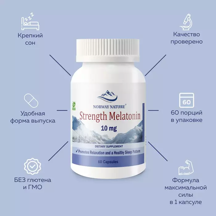 Мелатонин Strength Melatonin (10 мг) от бренда Norway Nature — это высококачественная добавка, предназначенная для поддержки нормализации сна. В каждой упаковке содержится 60 капсул, которые помогут вам улучшить качество ночного отдыха.