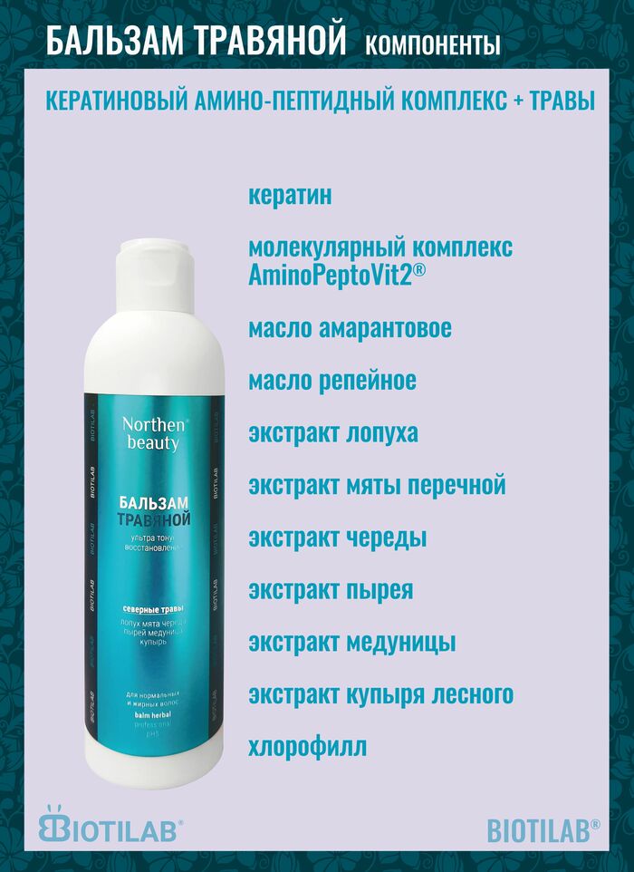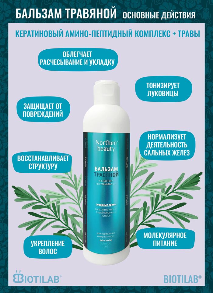 Бальзам Травяной от бренда Nothern beauty — профессиональный увлажняющий и восстанавливающий уход для нормальных и жирных волос, 250 мл. Помогает вернуть волосам мягкость, эластичность и здоровый вид.