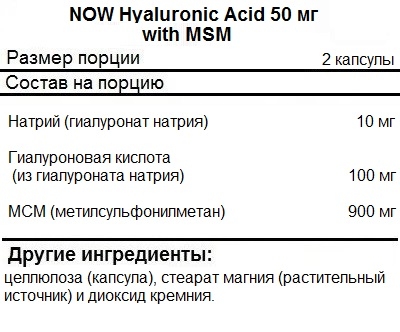Гиалуроновая кислота — это соединение, присутствующее во всех тканях организма, причем самые высокие концентрации встречаются в соединительных тканях, таких как кожа и хрящ. Гиалуроновая кислота — важный компонент суставной жидкости, где она служит смазкой и играет роль в сопротивлении силам сжатия. МСМ добавлен в этот продукт в качестве природного соединения серы, содержащего химические связи, необходимые для формирования и укрепления соединительных тканей в организме человека, в том числе суставного хряща.