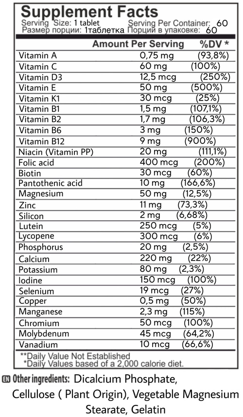 • Энергия и выносливость: Комплекс витаминов и минералов помогает повысить уровень энергии и выносливости в течение дня.