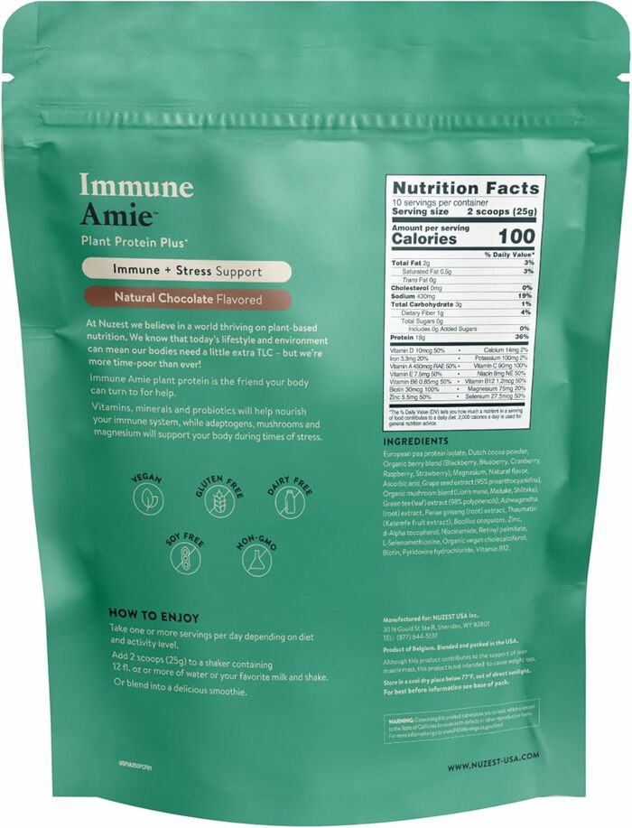 Premium European golden pea protein with vitamins, minerals, probiotics, and adaptogens supporting healthy immunity and stress.