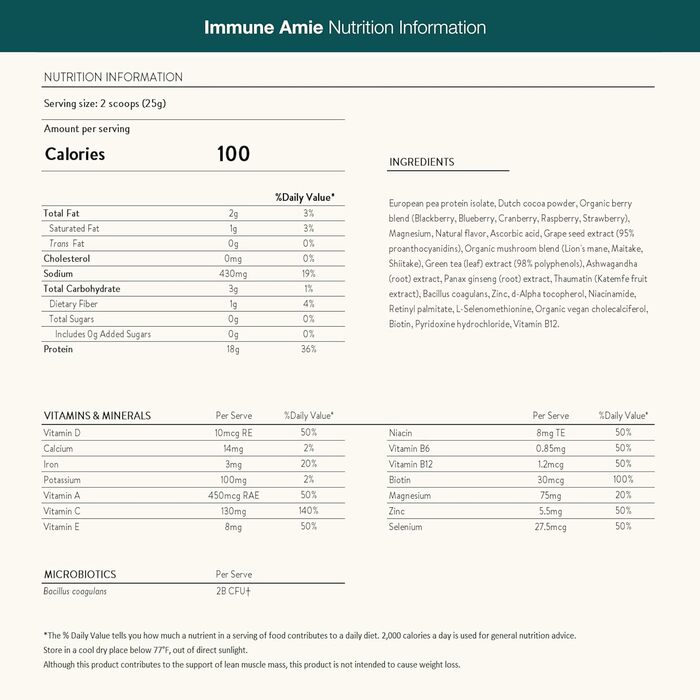 ИнгредиентыEuropean pea protein isolate, dutch cocoa powder, organic berry blend (blackberry, blueberry, cranberry, raspberry, strawberry), magnesium, natural flavor, ascorbic acid, grape seed extract (95% proanthocyanidins), organic mushroom blend (lion's mane, maitake, shiitake), green tea (leaf) extract (98% polyphenols), ashwagandha (root) extract, panax ginseng (root) extract, thaumatin (katemfe fruit extract), bacillus coagulans, zinc, d-alpha tocopherol, niacinamide, retinyl palmitate, l-selenomethionine, organic vegan cholecalciferol, biotin, pyridoxine hydrochloride, vitamin b12.
