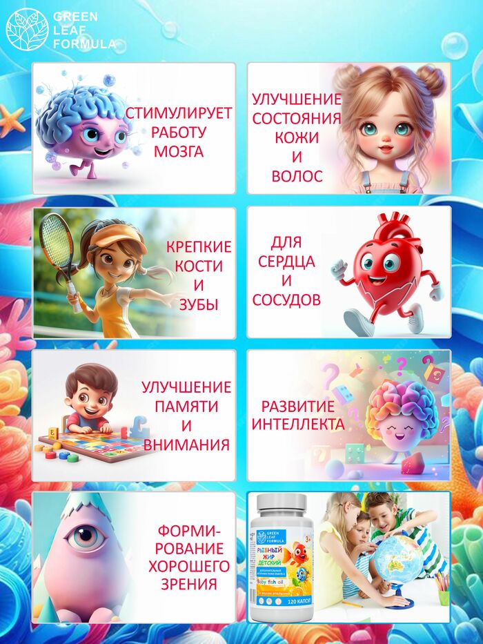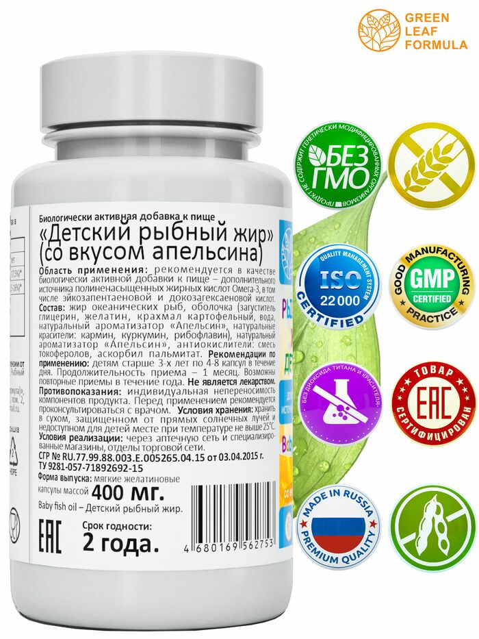 Омега 3 для детей со вкусом апельсина от бренда GREEN LEAF FORMULA — это отличный способ обеспечить вашего ребенка необходимыми жирными кислотами. В каждой упаковке содержится 120 капсул, которые легко принимать и которые помогут поддержать здоровье вашего малыша.