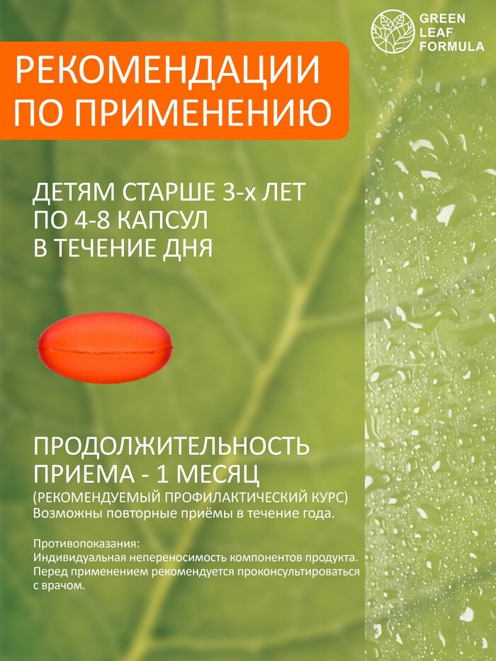 Капсулы имеют приятный апельсиновый вкус, что делает их прием удобным и приятным для детей. Продукт подходит для ежедневного использования и может быть полезен в периоды активного роста и развития.
