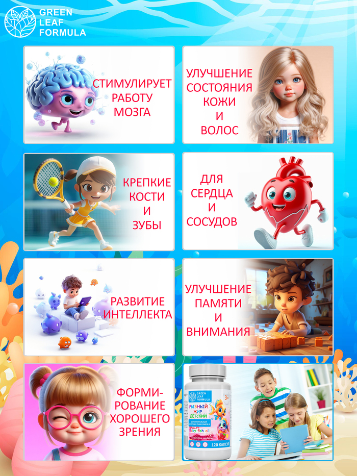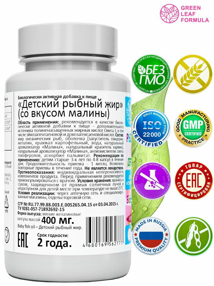 Капсулы имеют приятный малиновый вкус, что делает их прием легким и приятным для детей. Продукт от бренда GREEN LEAF FORMULA подходит для ежедневного использования и может быть включен в рацион вашего ребенка.