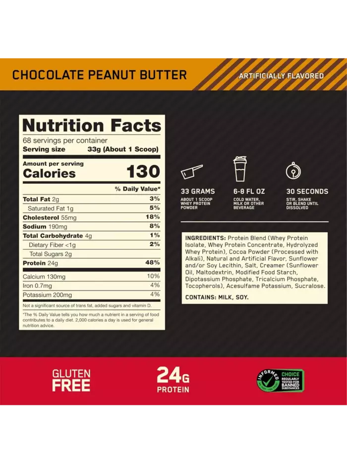 Протеин Gold Standard 100% Whey Шоколадно-Арахисовая Паста — это высококачественный спортивный продукт, предназначенный для поддержки ваших тренировок и достижения оптимальных результатов. Этот сывороточный протеин содержит 24 г белка на порцию, что способствует восстановлению мышц и их росту. Формула обогащена витаминами и минералами, а также важными аминокислотами, включая BCAA, что делает его идеальным выбором для спортсменов и активных людей.