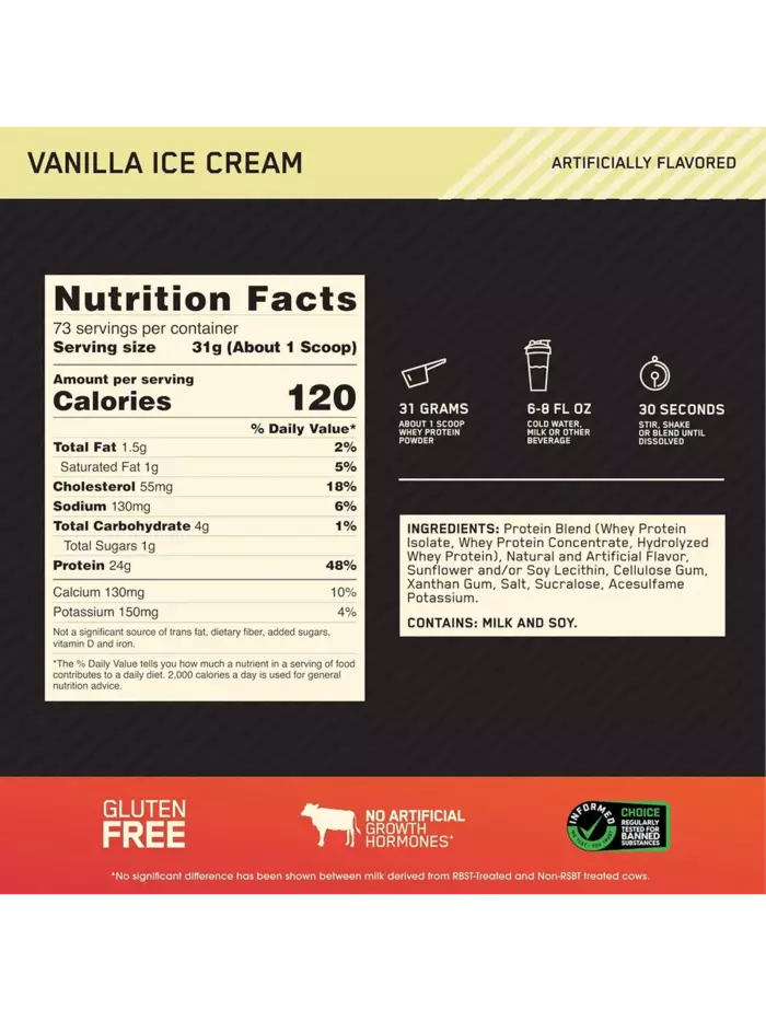 Optimum Nutrition Сывороточный протеин 100% Whey Gold Standard Ванильное мороженое, 2270 г — это высококачественный источник белка, который помогает в достижении ваших фитнес-целей, поддерживая рост и восстановление мышечной массы. Этот продукт идеально подходит для спортсменов, бодибилдеров и всех, кто стремится улучшить свою физическую форму и общее самочувствие.Преимущества и свойства:Высокое содержание белка:Каждая порция содержит 24 г чистого сывороточного белка, который способствует росту и восстановлению мышц после интенсивных тренировок.Быстрое усвоение:Сывороточный протеин быстро усваивается организмом, обеспечивая мгновенное поступление аминокислот в мышцы.Низкое содержание жиров и углеводов:Продукт содержит минимальное количество жиров и углеводов, что делает его идеальным для тех, кто следит за калорийностью своего рациона.Поддержка иммунной системы:Протеин обогащен глутамином и BCAA, которые поддерживают иммунную систему и способствуют быстрому восстановлению после нагрузок.Отличный вкус:Ванильное мороженое — это классический вкус, который делает каждую порцию настоящим удовольствием.Особенности:Optimum Nutrition 100% Whey Gold Standard отличается высокой степенью очистки и качеством ингредиентов. Продукт не содержит искусственных красителей и подсластителей, что делает его безопасным и полезным выбором для вашего здоровья. Он подходит как для профессиональных спортсменов, так и для любителей фитнеса, стремящихся к максимальным результатам.Условия хранения:Храните продукт в сухом и прохладном месте, защищенном от прямых солнечных лучей. После открытия упаковки рекомендуется использовать продукт в течение 3 месяцев для сохранения его свежести и эффективности. Закрывайте крышку плотно после каждого использования, чтобы избежать попадания влаги.О бренде Optimum Nutrition:Optimum Nutrition это бренд, предлагающий продукцию для поддержания здоровья и укрепления мышц. С использованием высококачественного сырья и передовых технологий, Optimum Nutrition создает продукты, которые помогают людям поддерживать здоровье и достигать своих фитнес-целей. Более 30 лет Optimum Nutrition помогает людям по всему миру поддерживать здоровье и активность.