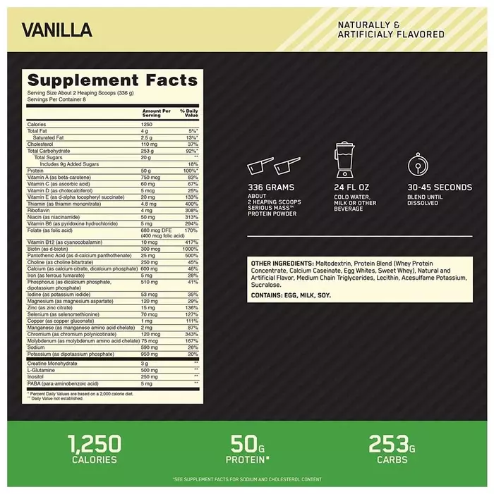 Serious Mass™ разработан для того, чтобы удобным способом получать дополнительные калории в течение дня. Поэтому он содержит значительное количество калорий, белков и углеводов.