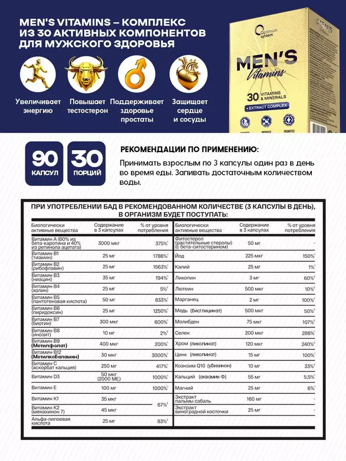 Витамин А - 3000 мкг, Витамин B1 (тиамин) - 25 мг, Витамин B2 (рибофлавин) - 25 мг, Витамин B3 (ниацин) - 35 мг, Витамин В4 (холин) - 25 мг, Витамин B5 (пантотеновая кислота) - 50 мг, Витамин B6 (пиридоксин) - 25 мг, Витамин В7 (биотин) - 300 мкг, Витамин В8 (инозит) - 10 мг, Витамин B9 (метилфолат) - 400 мкг, Витамин B12 (метилкобаламин) - 30 мкг, Витамин С (аскорбат кальция) - 250 мг, Витамин D3 - 50 мкг, Витамин E - 100 мг, Витамин K1 - 35 мкг, Витамин K2 (менахинон 7) - 45 мкг, Альфа-липоевая кислота - 25 мг, Йод - 225 мкг, Калий - 25 мг, Ликопин - 3 мг, Лютеин - 500 мкг, Марганец - 2 мг,