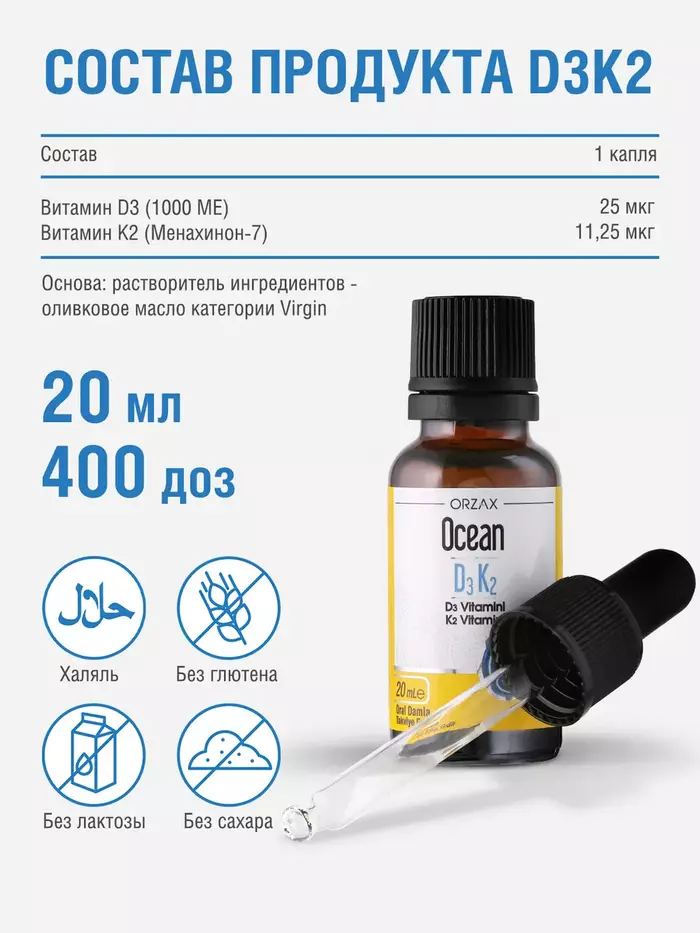 Orzax Витамины D3+K2 Ocean (1000 IU), 20 мл