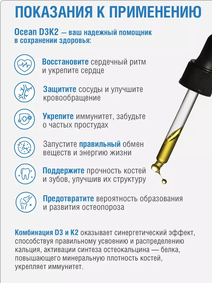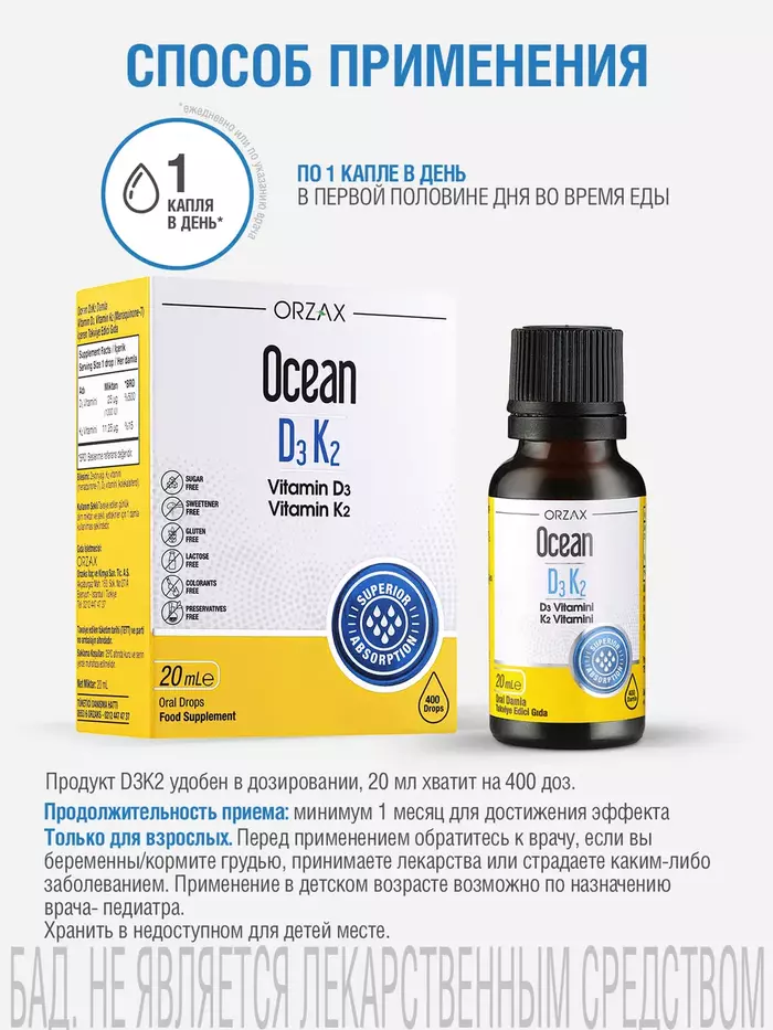 Витамины D3+K2 Ocean имеют приятный вкус и легко усваиваются организмом. Они подходят для людей всех возрастов и могут быть особенно полезны в период недостатка солнечного света.