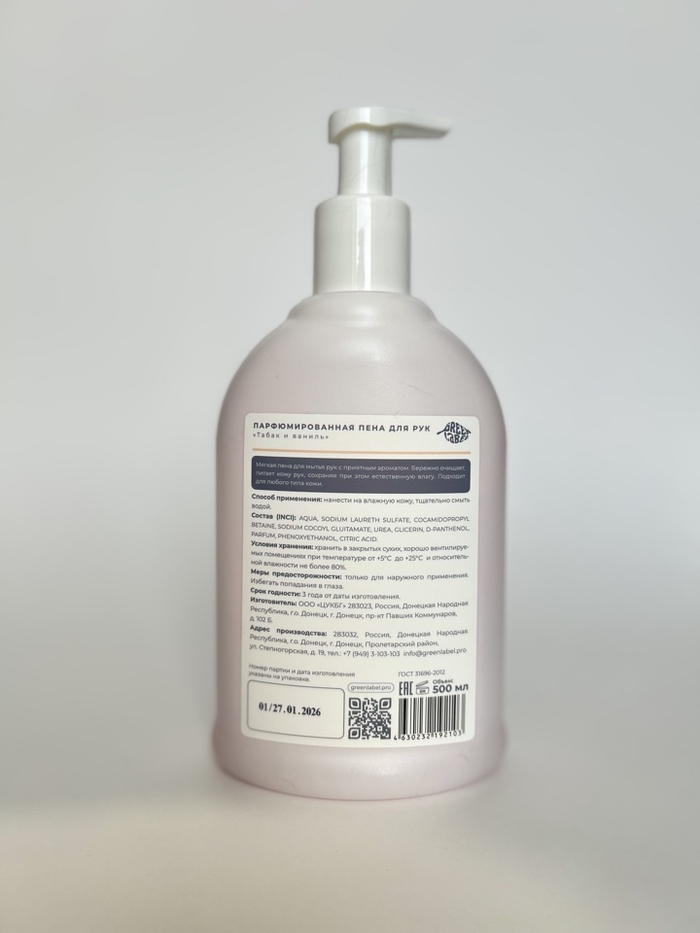 Green Label Парфюмированная пена для рук Табак и ваниль, 500 мл