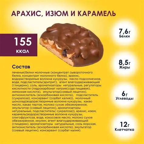 Печенье «Bombbar SNAQ FABRIQ» глазированное «Арахис, изюм и карамель» представляет собой здоровую и вкусную альтернативу традиционному печенью. Этот продукт создан для тех, кто хочет наслаждаться сладостями без вреда для фигуры и здоровья. Печенье изготовлено из высококачественных ингредиентов, включая молочные белки (концентрат сывороточного и молочного белка), арахис, водорастворимые волокна кукурузы и подсолнечное масло, что обеспечивает сбалансированный состав и высокое содержание белка.