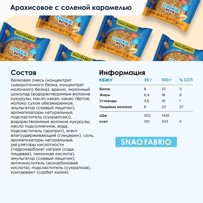 Печенье «Bombbar SNAQ FABRIQ» глазированное Арахисовый десерт с солёной карамелью представляет собой здоровую и вкусную альтернативу традиционному печенью. Это нежное печенье с хрустящей посыпкой и нежным шоколадом снизу — идеальный выбор для быстрого и полноценного завтрака или перекуса в школе или в дороге. Продукт приготовлен без сахара, вместо этого используя натуральные подсластители, такие как эритрит и сукралоза.