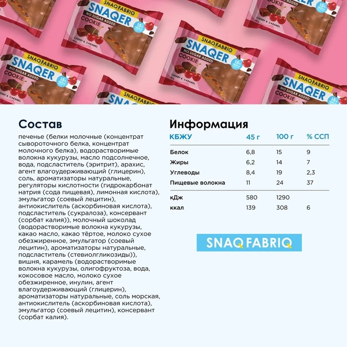 Упаковка содержит 10 штук печенья, что делает его удобным для перекусов в офисе, школе или во время путешествий. Печенье «Bombbar SNAQ FABRIQ» «Вишня и карамель» является вкусным и относительно полезным вариантом для тех, кто любит сладости, но предпочитает более сбалансированное питание.