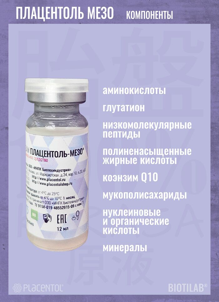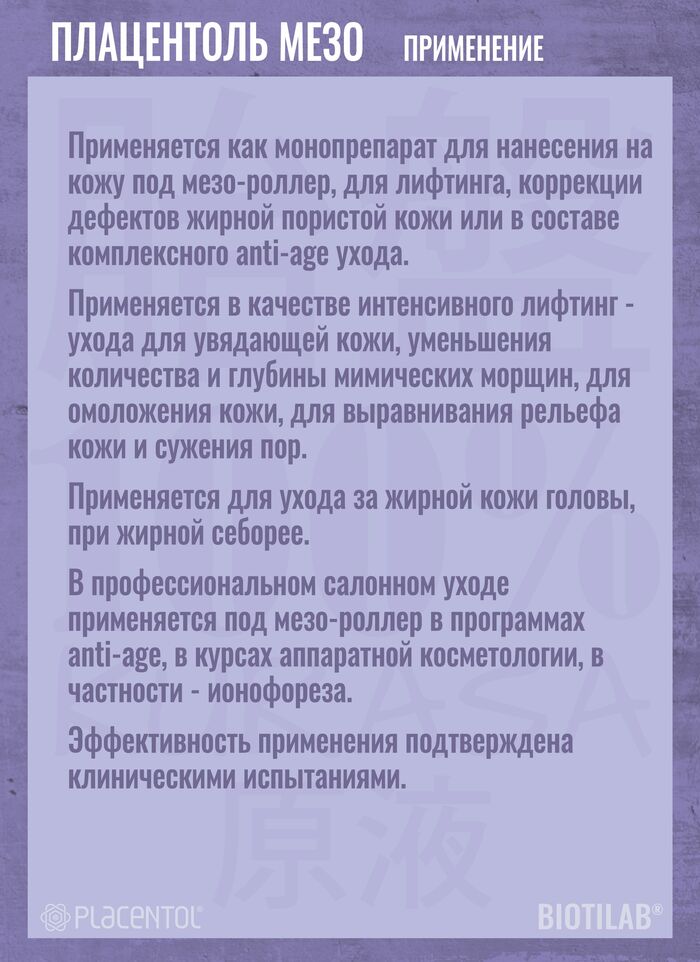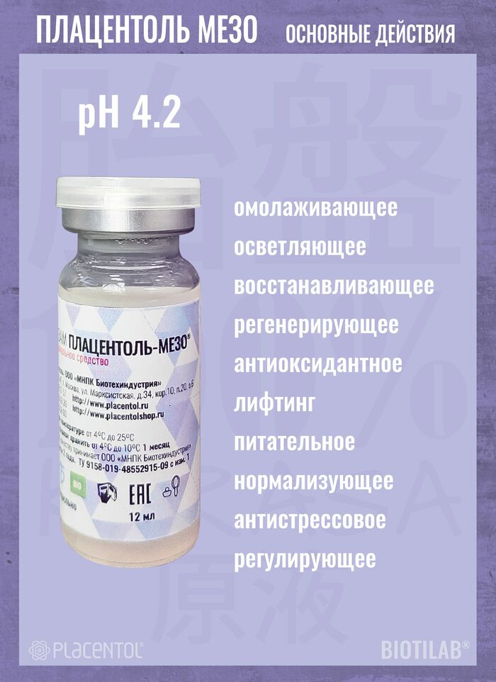 Пептидная лифтинг-биосыворотка "Плацентоль-Мезо" оказывает профессиональный уход за кожей лица и шеи. Оказывает омолаживающее, подтягивающее действие, уменьшает глубину мимических морщин.Применяется в аппаратной косметологии и под мезо-роллер,а также для повседневного ревитализирующего ухода.Раньше Вам приходилось тратить много времени и сил на поиск действительно хорошего средства для ухода за кожей,либо этих уходовых средств было множество, но теперь Вы можете об этом забыть,ведь сыворотка прекрасно справляется с комплексным уходом.Найти хорошее и доступное антивозрастное средство действительно сложно,но это уже в прошлом,ведь наша сыворотка прекрасно справляется со своей задачей. В составе имеется 20 аминокислот,которые работают на улучшение Вашей кожи в полной мере.Удобство сыворотки заключается в том,что она подходит для нескольких видов использования,что делает ее универсальным средством.Уже после первого применения Вы будете наблюдать положительные изменения в качестве вашей кожи,которые не могут не радовать!Сыворотка для кожи лица Плацентоль-Мезо доказала свою эффективность в клинических испытаниях.На сыворотку идет гарантия на год от производителя.Если вы хотите убедиться в качестве товара,то по Вашему запросу мы предоставим сертификат. Если во время эксплуатации товара возникли проблемы,напишите нам и специалисты ответят на все интересующие вопросы,и помогут с их решением.Плацентоль-Мезо – лучшее средство для ухода и омоложения вашей кожи!