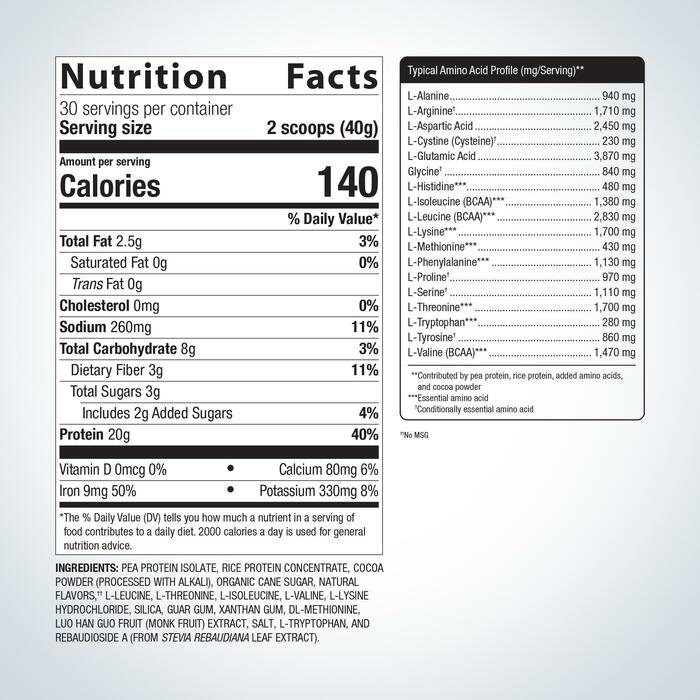 ИнгредиентыИзолят горохового белка, концентрат рисового белка, органический какао-порошок (обработанный щелочью) органический тростниковый сахар, натуральные ароматизаторы , L-лейцин, L-треонин, l-изолейцин, L-валин, L-лизина гидрохлорид, диоксид кремния, гуаровая камедь, ксантановая камедь, L-метионин, экстракт плодов монаха, соль, L-триптофан, ребаудиозид А (из экстракта листьев стевии ребаудиана).