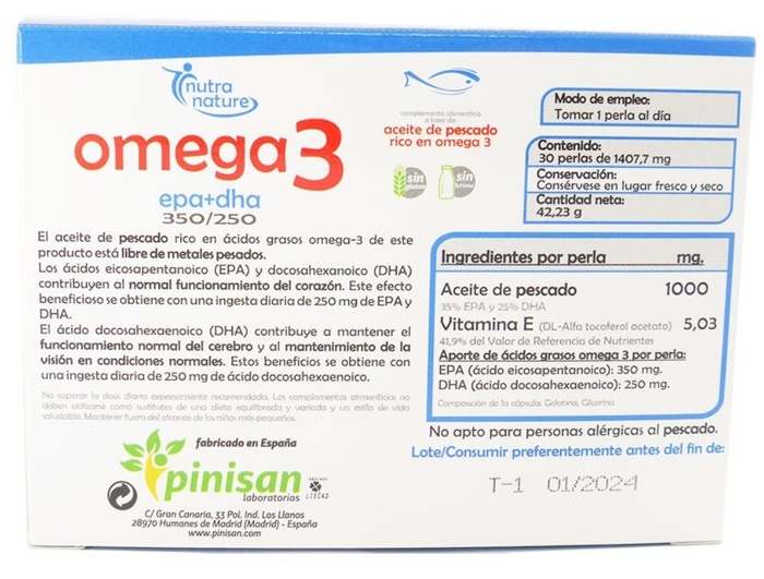 Pinisan Omega 3 30 Perlas — это высококачественный источник омега-3 жирных кислот, который поддерживает здоровье сердца и сосудов. В каждой упаковке содержится 30 капсул, которые легко принимать и которые обеспечивают ваш организм необходимыми полезными веществами.