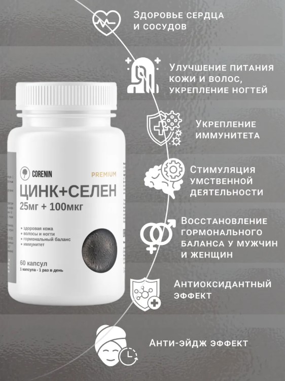 Цинк + Селен от бренда Corenin — это высококачественная пищевая добавка, содержащая важные микроэлементы, необходимые для поддержания здоровья организма. В каждой упаковке вы найдете 60 таблеток, которые помогут восполнить дефицит цинка и селена.