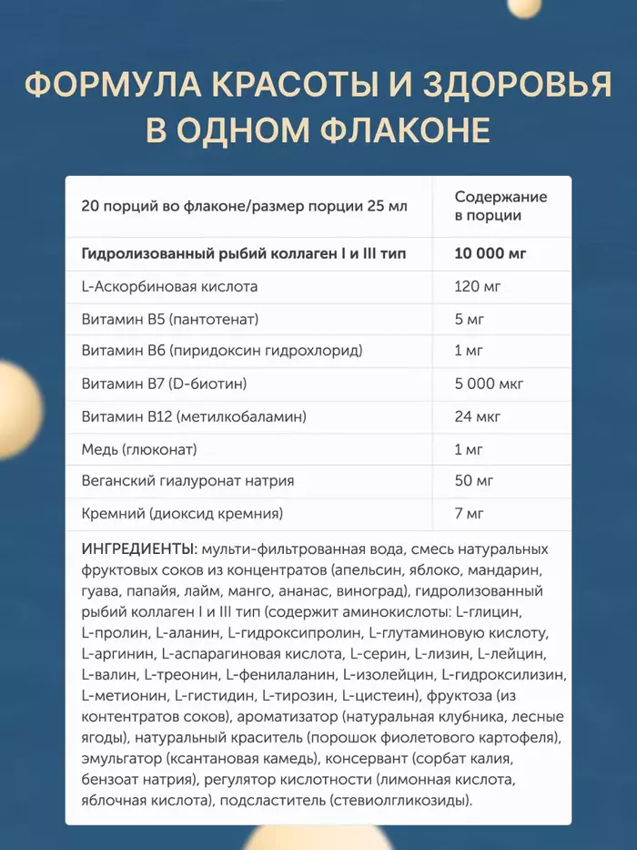 Наш морской коллаген жидкий представляет собой высокоэффективное сочетание морских пептидов коллагена, витаминов и гиалуроновой кислоты, созданное для достижения максимальных результатов. В каждой порции (25 мл) содержится 10 000 мг пептидов рыбьего коллагена, полученных из чешуи диких морских рыб. Витамины С, B5, B6, D-биотин (5000 мкг), B12, гиалуроновая кислота, кремний и медь дополняют действие коллагена, способствуя замедлению процессов старения.