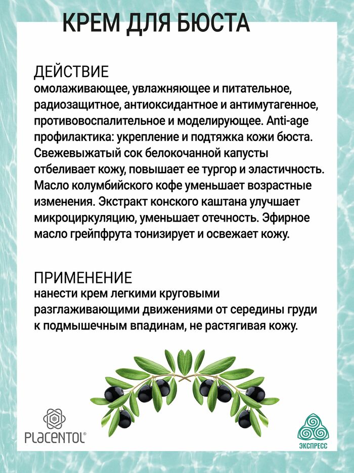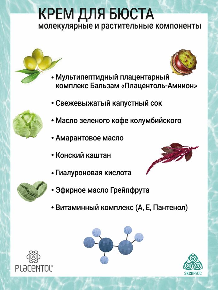 Плацентоль Лифтинг крем для бюста-это универсальное средство с комплексным эффектом для бюста. Женская косметика для бюста, которая должна быть у каждой леди для получения невероятного эффекта омоложения и чистой кожи уже после первого применения.Крем оказывает комплексный эффект. Действует как крем для бюста и как средство для омоложения кожи.Назначение: эффективный крем для бюста и области декольте. Комплексный эстетический и оздоровительный уход. Профилактика мастопатии.Действие омолаживающее, увлажняющее и питательное, радиозащитное, антиоксидантное и антимутагенное, противовоспалительное и моделирующее. Anti-age профилактика: укрепление и подтяжка кожи бюста. Свежевыжатый сок белокочанной капусты отбеливает кожу, повышает ее тургор и эластичность. Масло колумбийского кофе уменьшает возрастные изменения. Экстракт конского каштана улучшает микроциркуляцию, уменьшает отечность. Эфирное масло грейпфрута тонизирует и освежает кожу.Плацентоль Лифтинг крем для бюста доказал свою эффективность в клинических испытаниях.На него идет гарантия на год от производителя.Если вы хотите убедиться в качестве товара,то по Вашему запросу мы предоставим сертификат. Если во время эксплуатации товара возникли проблемы,напишите нам и специалисты ответят на все интересующие вопросы,и помогут с их решением.Крем Плацентоль Лифтинг крем для бюста– лучшее средство для Вашей кожи!