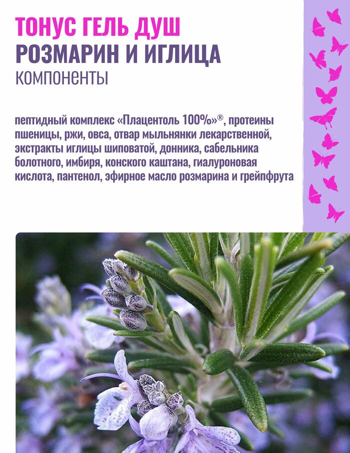 Гель для душа Плацентоль Тонус актив Розмарин и иглица — очищающий, расслабляющий и освежающий продукт с антицеллюлитным эффектом. Объём 250 мл — для ухода, который помогает коже выглядеть более подтянутой и свежей после каждого применения.