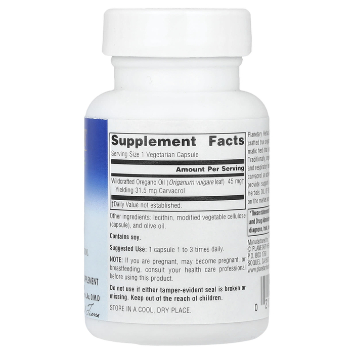 Масло орегано от Planetary Herbals получают из натуральных листьев орегано (Origanum vulgare), ароматической травы, произрастающей в Средиземноморском регионе. Традиционно орегано использовали для поддержания здоровья пищеварительной и дыхательной систем. Исследования in vitro показывают, что карвакрол, активный компонент масла орегано, может оказывать поддержку иммунной системе. Масло орегано Planetary Herbals - одно из самых эффективных на рынке, оно стандартизировано до 70% карвакрола.